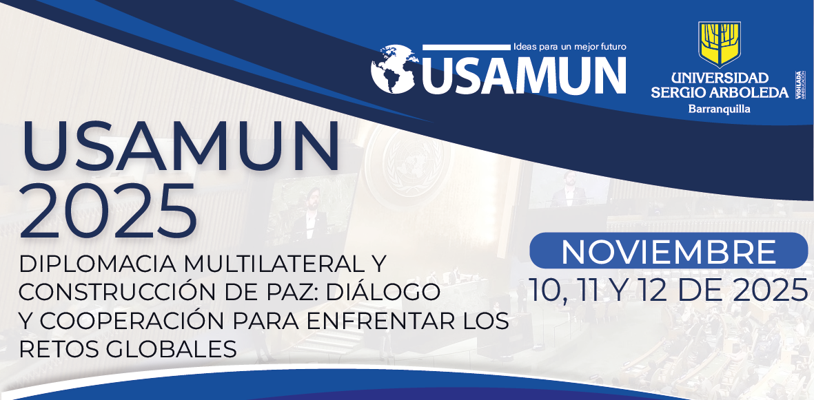 El Modelo de Naciones Unidas organizado por la Universidad Sergio Arboleda sede Barranquilla, es un escenario académico que promueve el diálogo y la diplomacia como herramientas clave para abordar problemáticas reales y actuales que afectan a la comunidad internacional. Bajo el lema “Diplomacia Multilateral y Construcción de Paz: Diálogo y cooperación para enfrentar los retos globales”, este espacio busca fomentar la cooperación entre diferentes actores, impulsando soluciones colectivas a los desafíos más urgentes del mundo contemporáneo.