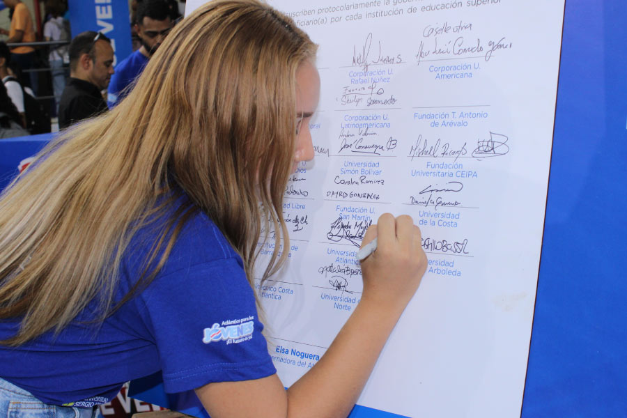Durante el acto ceremonial, la estudiante del programa de Comunicación Social y Periodismo, Andrea Silva, fue la encargada de firmar el acta de compromiso que sella esta importante iniciativa de la Gobernación del Atlántico.