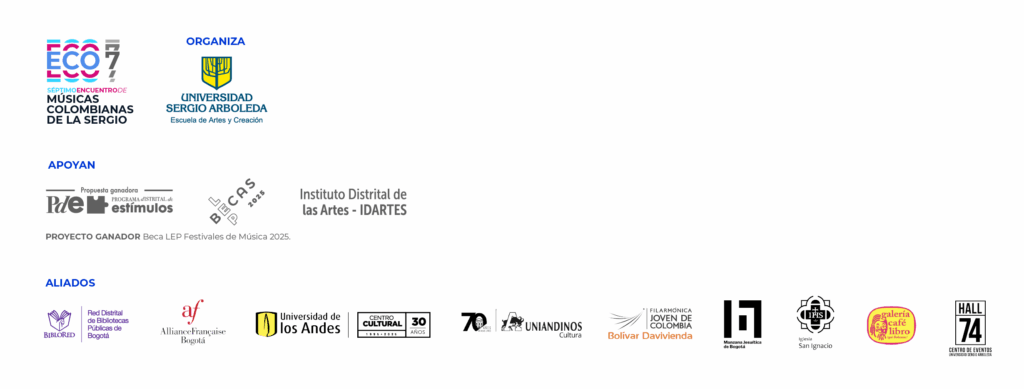 ECO7 sale de La Sergio y del 19 al 27 de septiembre de 2025 programará 17 conciertos presenciales de acceso libre en diferentes espacios culturales de la ciudad, entre ellos, UNIANDINOS, las bibliotecas públicas La Marichuela, Participación y Virgilio Barco, el Auditorio Mario Laserna de la Universidad de los Andes, los auditorios de la Alianza Francesa en las sedes Centro y Chicó, la Iglesia San Ignacio de la Manzana Jesuítica, Galería Café Libro de la 93 y el Centro de Eventos Hall74 de la Universidad Sergio Arboleda.