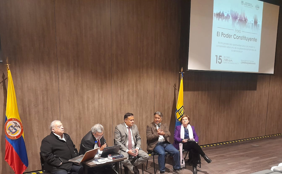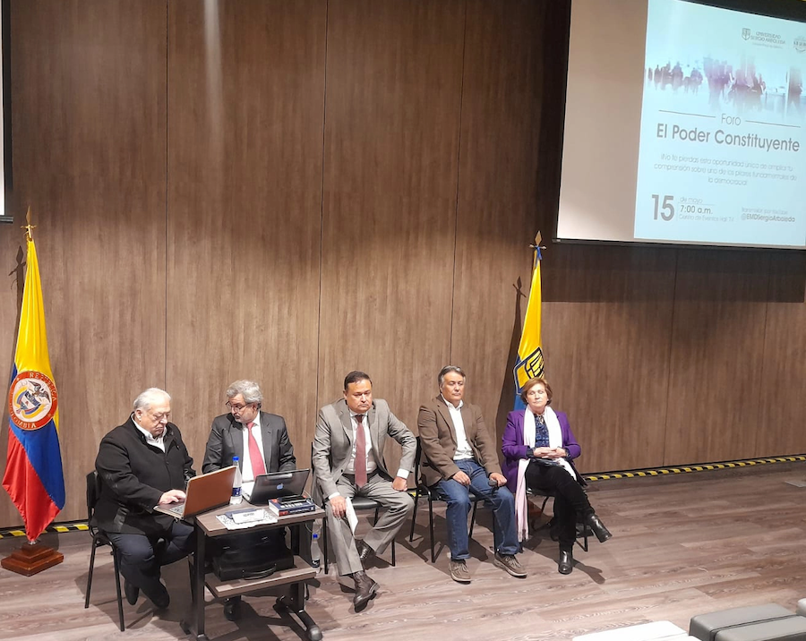 Como consecuencia, el Departamento de Derecho Público de la Universidad Sergio Arboleda, en su esfuerzo por promover los debates académicos sobre asuntos de actualidad, adelantó un foro que se llevó a cabo el pasado 15 de mayo, con la Doctora Pilar Sáchica, el Doctor Alejandro Vélez, el Doctor Luis Javier Moreno, el Doctor Juan Pablo Liévano y el Director del Departamento de Derecho Público, todos profesores de la Escuela Mayor de Derecho, con miras a conocer el alcance teórico del concepto de constituyente primario, su desarrollo en la historia constitucional de Colombia y las vicisitudes que podrían oponerse a los límites representados por instituciones como el Estado de Derecho.