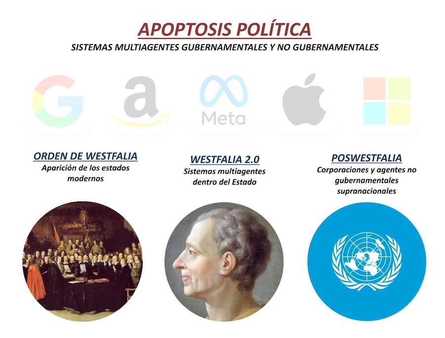 No obstante, este sistema de agencia se fue diversificando, es decir, también fue dando paso a multiagentes internos que controlan ciertas potestades del Estado. Este acontecimiento vino de la mano de Montesquieau, a quien debemos la estructura de las ramas del poder legislativo, ejecutivo y judicial. Dicha estructura multifacética del poder se separó de una visión monolítica del Estado, entendido este como único agente capaz de controlar la información social, y que ahora está en manos de diferentes potestades. A esto es a lo que Floridi denomina la Westfalia 2.0. Pero, como se entenderá, esta nueva multiagencia ha seguido dilatándose, en especial porque las TIC digitales han dado cabida a la multiplicación de poderes en el marco del control de la información de la sociedad, como lo muestra el gran impacto que tienen los medios de comunicación y las redes digitales en la gobernanza nacional e internacional. Un buen antecedente de estas transformaciones que han surgido es la fundación de instituciones supranacionales, como la Organización de las Naciones Unidas (ONU) –por poner un ejemplo-, que tienen potestades y controles políticos que están más allá de los estados nacionales. Floridi llama a este periodo Poswestfalia, pues este es un momento en el que hay una multiagencia que supera las ínfimas formas de control de la información que tiene el estado nacional, hasta el punto que depende de agentes no gubernamentales como los gigantes del mundo de la información, entre ellos Google, Amazon, Meta, Apple o Microsoft.